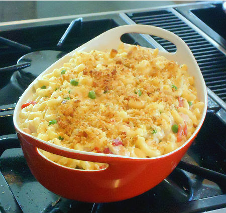 Sprinkle crushed Ritz crackers on top and bake at 350 until golden brown at edges (about 30 to 45 minutes).