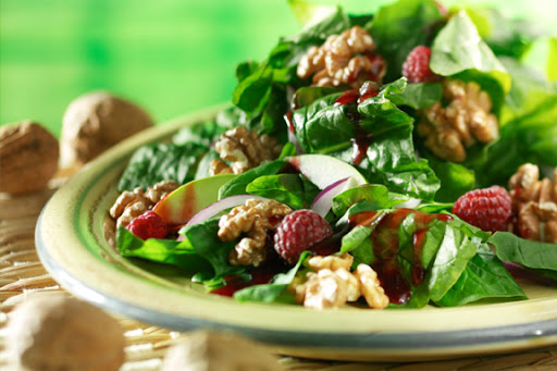 In small bowl, whisk together oil, vinegar, raspberry spread, salt and pepper; drizzle over salads. *(Warm the dressing, if desired)