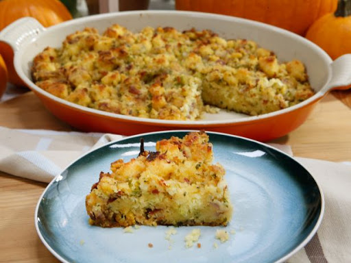 For the cornbread: In a large bowl, add the cornbread and toss with the Cheddar Jack, mozzarella, parsley and scallions. Season with salt and pepper.