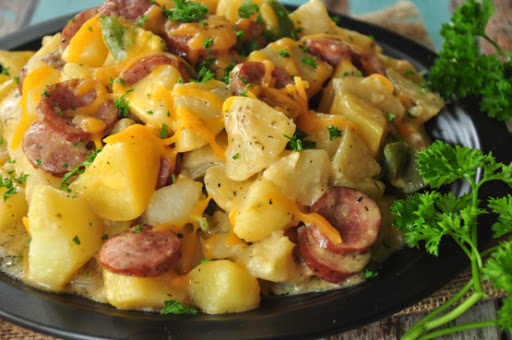 In dutch oven, brown potatoes, kielbasa, onion and peppers in oil.