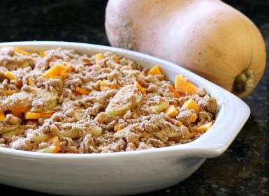This crumble-topped butternut squash casserole is made with a combination of sliced butternut squash and apples. The brown sugar crumble topping is lightly spiced with cinnamon and nutmeg.