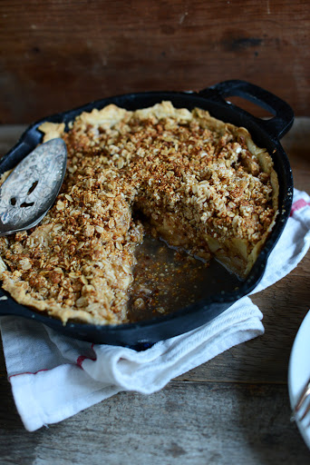 gently over a 10-inch cast iron skillet or pie baking dish and gently form it to the edges with your fingers. It should extend to the top of the pan but you don't have to crimp the edges or anything - we're going for rustic. Refrigerate until you're ready to add the apples.