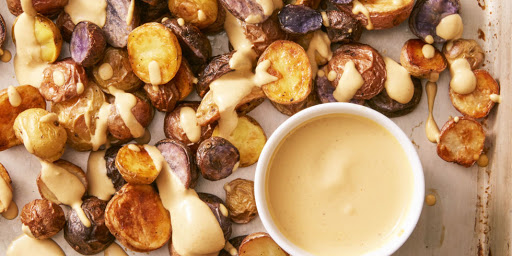 Meanwhile in blender, puree cashews, lemon juice, chili powder, cumin, paprika, garlic powder, sea salt, nutritional yeast, and jalapeno with 1 cup water until smooth. Transfer to 2-quart saucepan; heat on medium-low 5 minutes or until warm, stirring occasionally. Makes about 1 2/3 cup. Transfer to bowl; serve with roasted potatoes. (Refrigerate remaining sauce up to 1 day. Also good with tortilla chips, roasted cauliflower, etc.)