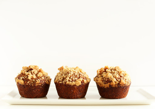 Quickly wipe your mixing bowl and add crumble ingredients. Prepare crumble top by mashing ingredients together with a fork until crumbly like wet sand. Generously top muffins with streusel. You should have leftovers.