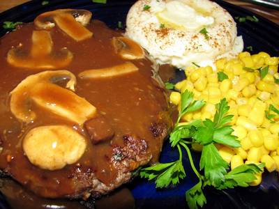 6. To serve, place 1 steak, serving of corn, and 1 serving of mashed potatoes on each of 4 plates and place 1/4 of the mushroom gravy over each steak. Serve immediately.
