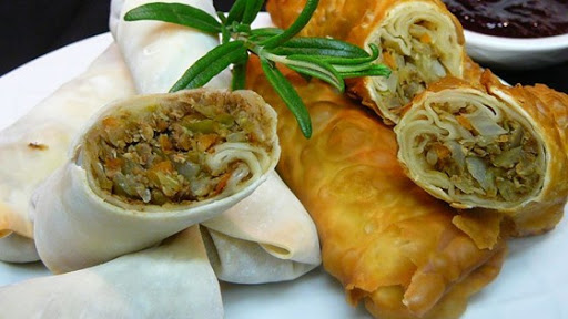 To fill the wrappers, separate and place the spring roll wrappers onto your work surface, with the points of the square pointing up and down in a diamond shape. Spoon about 2 tablespoons of the turkey filling in a line across the center of the wrapper, and fold the bottom point up to cover the filling. Fold the two side points in on top of the folded wrapper, to fully enclose the filling. The two side points should be about 1 inch apart. Firmly but gently, roll the spring roll into a tight cylinder, and roll the wrapper over to firmly press down the remaining point. Set the filled wrappers seam-side down onto the parchment-lined baking sheets so they don't touch. The rolls should be about the thickness of a finger.