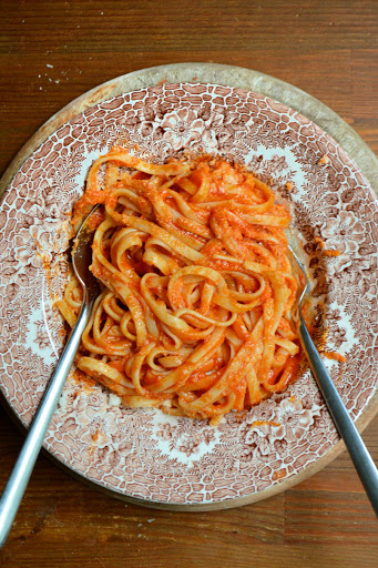 If you have ever made Marcella Hazan’s glorious butter and onion tomato sauce, then you know that it can take a bit of time to make (even though it is considered to be the simplest of her sauce recipes). It tastes phenomenal, but I would rather save it for a Sunday dinner. Here is a ‘weeknight version‘ that’s ready in half the time of the original recipe. The sauce is cooked at a higher temperature but the butter and onion flavours still shine through.