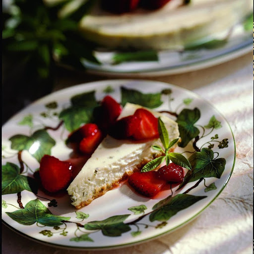 To serve, place cheesecake on a platter and run a knife around the inside of the pan; remove pan sides. Make 3 lengthwise cuts in each whole berry; press lightly and arrange fanned berries in the center of the cheesecake. Garnish with a sprig of lemon verbena (or lemon balm). Top each serving with strawberries and juice and garnish with another sprig of verbena (or lemon balm).