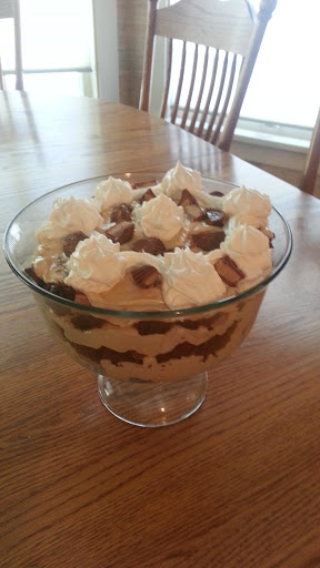 In a large bowl, whisk milk and pudding mixes for 2 minutes, mixture will be thick. Add the peanut butter and vanilla, mix well. Fold in 1 1/2 of the tubs of Cool Whip. Place 1/3 of the brownies in a 5 qt. Triffle Bowl; top with 1/3 of the remaining peanut butter cups, spoon 1/3 of the pudding mixture over the top. Repeat layers twice. Cover with remaining whipped topping and garnish with peanut butter cups. Refrigerate until chilled well.
