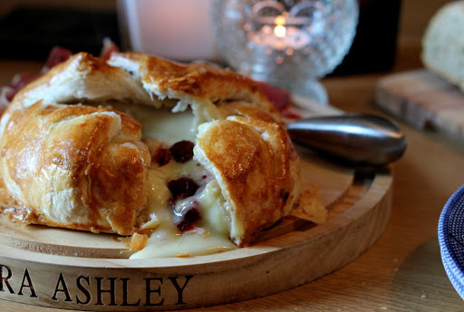 Wrap in puff pastry. Brush with egg yolk. Sprinkle with poppy seeds.