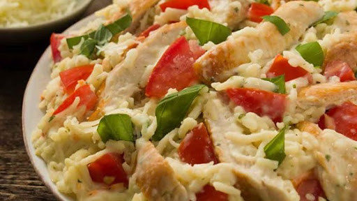 Stir in chicken and tomatoes. Sprinkle with mozzarella and basil.