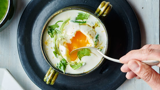 Carefully place a poached egg and some leek mixture in the center of each bowl of soup and drizzle with oil.