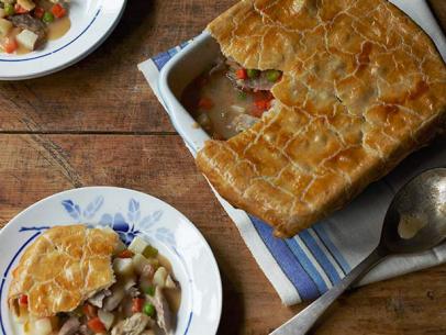 Melt butter in saucepan and cook chopped onion until tender. Stir in celery and carrots and cook for 2 minutes. Stir in flour and cook for 2 minutes. Add chicken stock and bring to a simmer. Add potatoes and simmer until tender. Stir in turkey, parsley and peas. Pour mixture into casserole. Top with pie crust and brush with egg. Bake for 30 minutes until crust is golden.