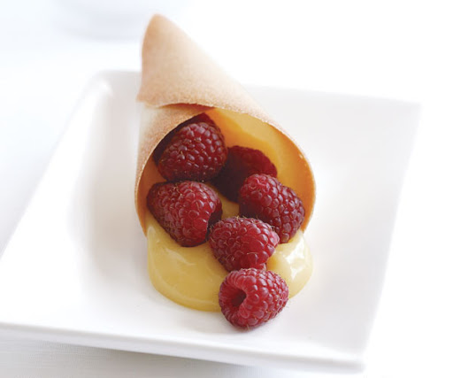 Fill a tuile cone with lemon curd and berries