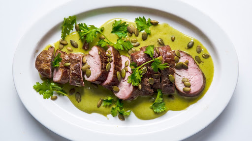 Serve pork over sauce topped with cilantro and pumpkin seeds.