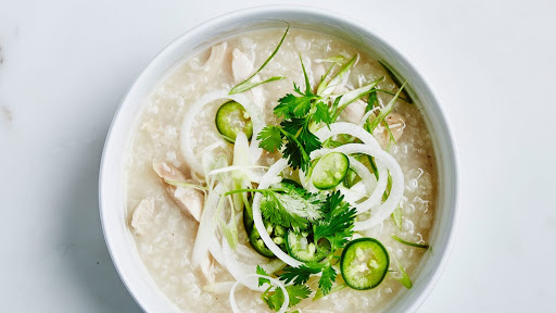 Strain broth through a fine-mesh sieve into a large bowl; discard solids. Return broth to pot and add rice, fish sauce, and palm sugar. Bring to a simmer and cook until rice is very tender, 18–20 minutes. Shred chicken and return to pot; season soup with more fish sauce.