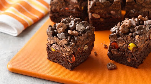 Make and bake brownies as directed on box for 9-inch pan. Cool completely, about 1 hour. Frost brownies with frosting. Sprinkle with peanut butter candies; refrigerate while making cereal mixture.