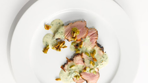 Slice pork and serve with curry sauce and cumin-spiced pumpkin seeds.