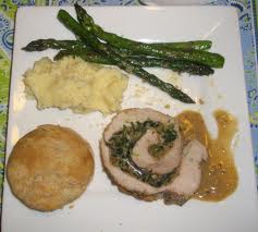 In a skillet, sauté mushrooms and onion in oil until tender. Stir in spinach, bread crumbs, salt, pepper, garlic powder and sage. Untie pork roast and separate the loins. Spread stuffing over one loin to within 1 in. of the edges. Top with the remaining loin; retie securely with heavy string. Place in an ungreased shallow baking pan. Bake, uncovered, at 325 degrees F for 2-1/2 hours or until a meat thermometer reads 160 degrees F-170 degrees F. Let stand for 15 minutes before slicing.