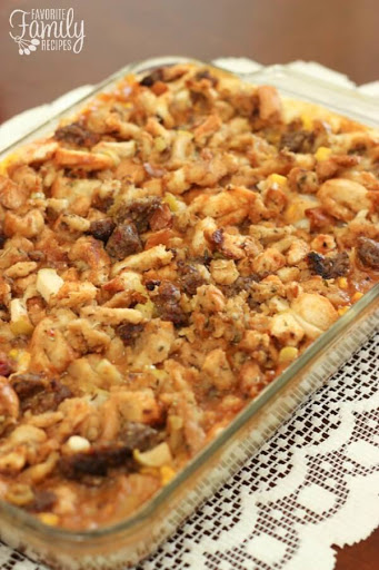 Combine turkey and cranberry sauce and spread evenly on the bottom of a 9x13 glass baking dish.