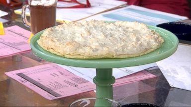 Make the topping by beating three egg whites stiff. Add 1/2 lb of powdered sugar and continue beating until thick. Then add 1 (8oz) package coconut flakes.