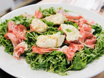 Distribute the arugula on 4 dinner plates. Place half a burrata, cut side down, in the middle of the plate and artfully arrange the prosciutto around it (I tear each slice of prosciutto in half lengthwise). Sprinkle with salt and pepper, and serve.