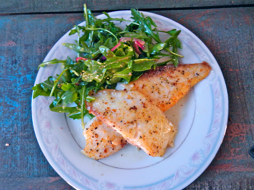I served my fish with a salad made of arugula, red onion sliced thinly, and some toasted almonds. I whipped up a quick vinaigrette (balsamic vinegar, olive oil, chopped garlic, salt and pepper). This recipe is super healthy and extra delicious.