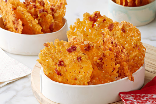 Try these Loaded Baked Potato Cheese Crisps for a savory appetizer. Top crispy potato chips with cheddar cheese and bacon in this flavorful recipe.