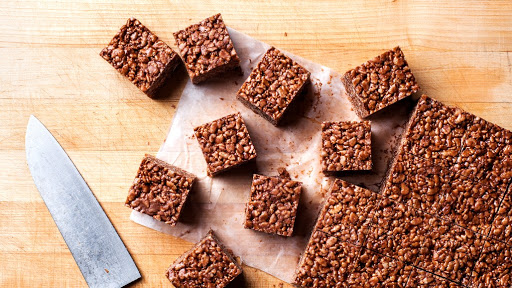 Just before serving, using parchment paper overhang, lift crispies out of pan and place upside down on a cutting board; remove parchment. Using a serrated knife, trim about ½" from all sides to make a squared-off rectangle, then cut into a 6x4 grid to make 24 squares. Place crispies on a wire rack, spacing at least 1" apart.