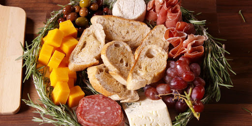 On a serving platter, arrange rosemary around the edge like a wreath. Inside, leaving room for another ring and bread or crackers in the middle, arrange cheddar, salami, grapes, prosciutto, goat cheese, and olives.