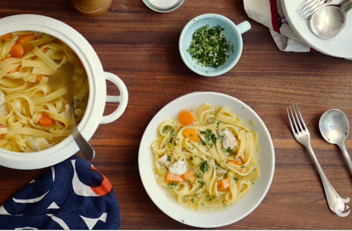 Pour broth into pot with vegetables and heat to a simmer. Add noodles and simmer until heated through, soft and plumped with chicken broth. Add the breast meat, then taste broth and add salt and pepper to taste. For best flavor, soup should have some golden droplets of fat on top; if needed, add more chicken fat one teaspoon at a time.