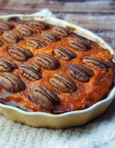 5. Turn your oven to low broil. Place the sweet potatoes under the broiler for 2-6 minutes, standing by (I have burnt the pecans by walking away-- it happens fast!). The topping should bubble and the pecans should toast. Serve warm.