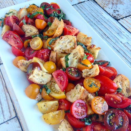 In a large bowl whisk 2/3 cup olive oil, 1/4 cup red wine vinegar and garlic; season with salt and pepper to taste. Add bread cubes, tomatoes and basil; toss to combine.