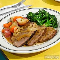 Slice the beef; serve with the gravy and vegetables.