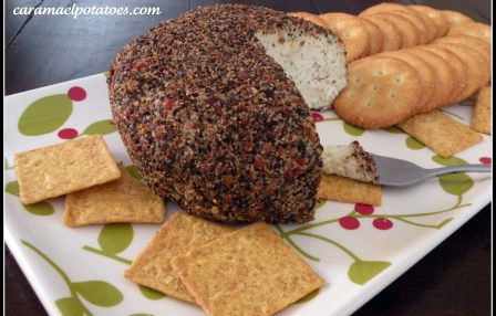Lets just think ahead about Thanksgiving dinner. Is there ever a gathering in the kitchen of hungry and impatient people? I know there is in mine, so it is always best to have a few munchies out to keep the crowd from getting ravenous. This cheese ball is great to have sitting out on the counter or the table to keep those bellies from starving while waiting just 20 more minutes {You know you claim this at least a few times on the big day}. And don’t start thinking there is no way there is time to make one more thing that day. {I know you are thinking it} You can make this a couple of days in advance and wrap it up tight in plastic wrap and keep it in the fridge until ready to serve.