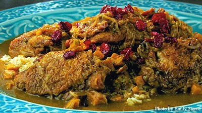Flip and brown meat-side. Remove chicken. Wipe out excess fat and saute the onions, potatoes, ginger, jalapeno, Craisins and curry powder and season. Add coconut milk and water, check for seasoning, then add chicken back. Bring to a simmer and cook chicken through, about 45 minutes. Serve family style on rice.