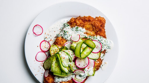 Drizzle cutlets with sauce, top with vegetables, then drizzle with a little more sauce. Sprinkle with Aleppo-style pepper.