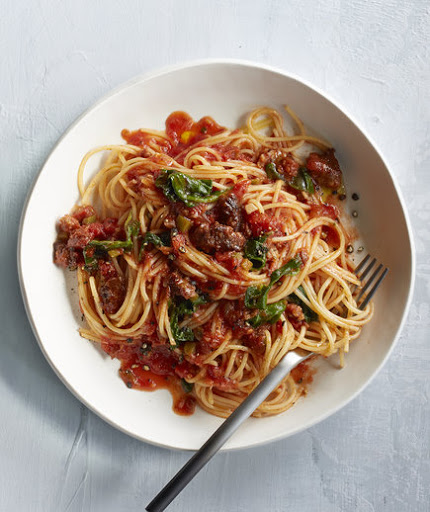 Reduce heat to medium. Stir in the sausage and simmer until the sauce has thickened, 10 to 15 minutes. Stir in the spinach and simmer until wilted, about 2 minutes. Toss the hot pasta with the sauce.
