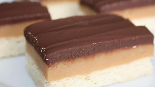 Place chocolate in a microwave-safe bowl. Heat for 1 minute, then stir and continue to heat and stir at 20 second intervals until chocolate is melted and smooth. Pour chocolate over the caramel layer and spread evenly to cover completely. Chill. Cut into 1 inch squares. These need to be small because they are so rich.