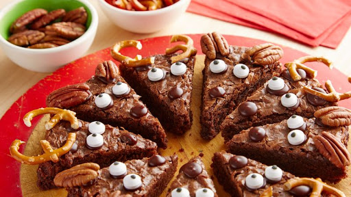 Place 2 small dots of icing on top corners of brownie triangle. For antlers, attach halved pretzel twists to dots of icing. Place 2 small dots of icing in middle of brownie; attach 2 candy eyeballs. Place a small amount of icing on tip of brownie triangle for nose. Repeat with remaining brownie triangles.