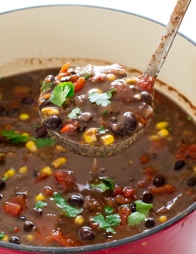 Stir in the tomatoes, all of the black beans, chicken broth, green chilies, corn, cumin and chili powder.
