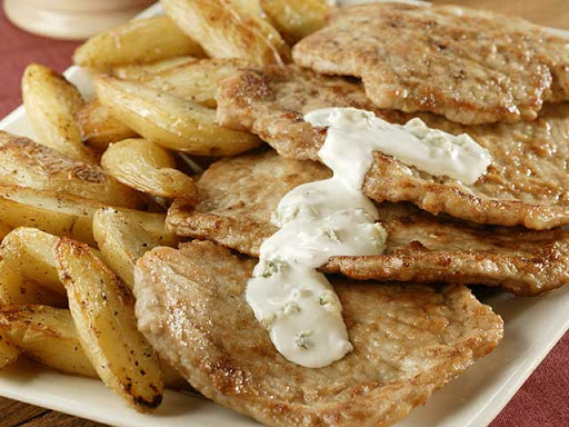 PORK CUTLETS WITH CREAMY BLUE CHEESE DRESSING & FINGERLING POTATOES