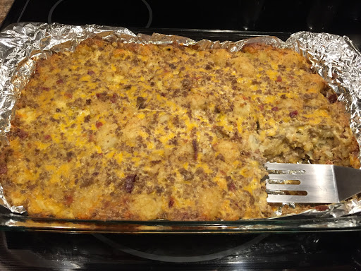 Mix all together and put in a foil lined and sprayed 9x13. Bake at 350 degrees for 50-60 mins.