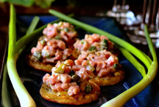 In a small bowl, combine the ham with the mayonnaise, scallion, Cornichons, capers, tarragon and mustard.