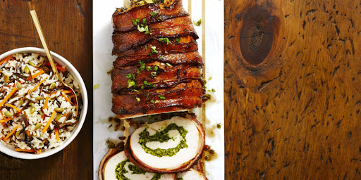 Sprinkle surface of turkey with 3/4 teaspoon salt. In food processor, pulse green onions, parsley, oil and garlic until finely chopped, stopping to stir occasionally. Spread herb mixture in even layer on breast. Starting with short side, roll breast tightly. Place seam side down. Drape bacon over turkey roll, overlapping slices slightly. Tuck ends of bacon under turkey roll. Using 16-inches pieces of kitchen string, tie turkey tightly at 11/2-inches intervals. (Turkey may be wrapped tightly in plastic and refrigerated up to overnight.) Transfer to rack fitted into roasting pan lined with foil. Add 4 cups water to bottom of pan. Roast 45 minutes.