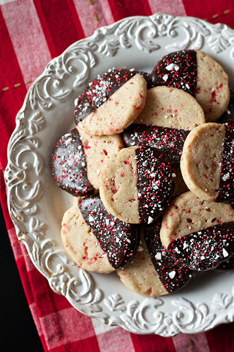 While cookies are baking and cooling, melt chocolate in the microwave in 30 second intervals, mixing well in between each interval. Add a few drops of peppermint oil once melted and stir well. Dip cooled cookies into the chocolate halfway and wipe excess chocolate off on the side of the bowl. Place on a wax paper-lined cookie sheet and sprinkle with crushed candy canes and nonpareils. Transfer the cookies to the fridge for about 15 minutes to let the chocolate set.