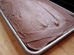 Mix first 5 ingredients. In a saucepan, bring butter & water to a boil, then stir in sugar mixture. Whisk in buttermilk, eggs & vanilla until well blended. Pour in greased & floured cookie sheet. (batter is thin)