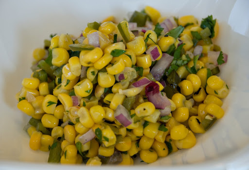 Roast the corn and Poblano chilies on a grill or BBQ and let cool. Cut the corn off the cob. Dice the Poblano chilies, onion, and red jalapenos. Combine all the ingredients and season to taste.