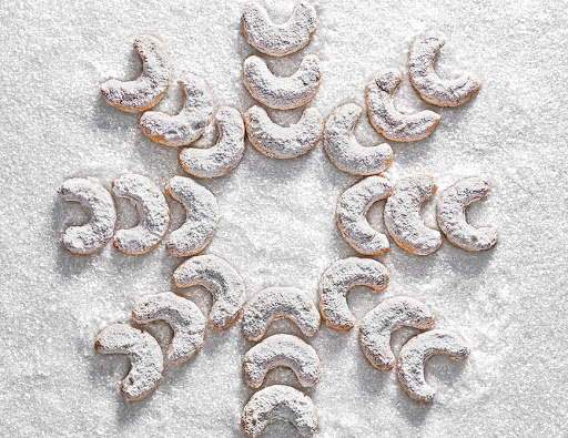 These snowy crescent-shaped cookies look lovely, and taste as good as they look. Cookies of this type (like Mexican wedding cookies or Pecan Snowballs) are chewy and still slightly crisp—and can often be dry. But these cookies are moist and tender inside with a delicious nutty flavor that is balanced perfectly with the sweetness from the powdered sugar. For the toasted walnuts you can substitute toasted pecans or even pistachios. Be sure to bake them on a parchment-lined baking sheet. While it might be tempting to just coat the cookie sheets with cooking spray, the parchment paper will keep the cookies from sticking. When the cookies are done baking, let them cool for one minute (they should be cool enough to handle, but still warm to the touch) before rolling them in powdered sugar. When the cookies are still warm, the sugar will adhere better and create a powdery, snowy look.