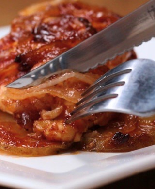 4. Lay the chicken on the potatoes, season with salt and pepper and spread on the barbecue sauce. Top with sliced onions.